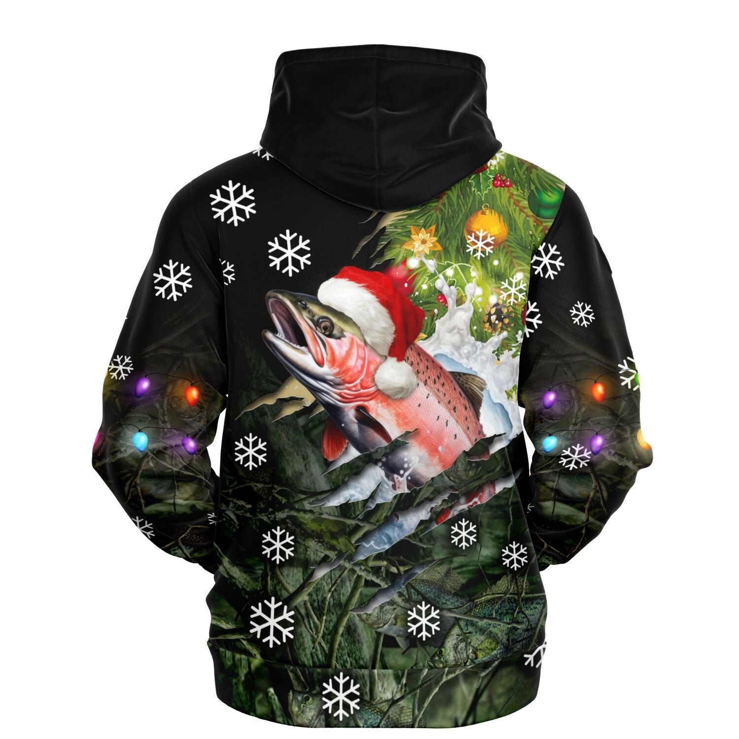 Make a splash this Christmas with the Rainbow Trout Christmas Hoodie! This vibrant all-over print hoodie combines your love for fishing with the festive spirit of the holidays. Featuring a colorful design of rainbow trout decked out in Christmas cheer, this hoodie is sure to turn heads wherever you go.